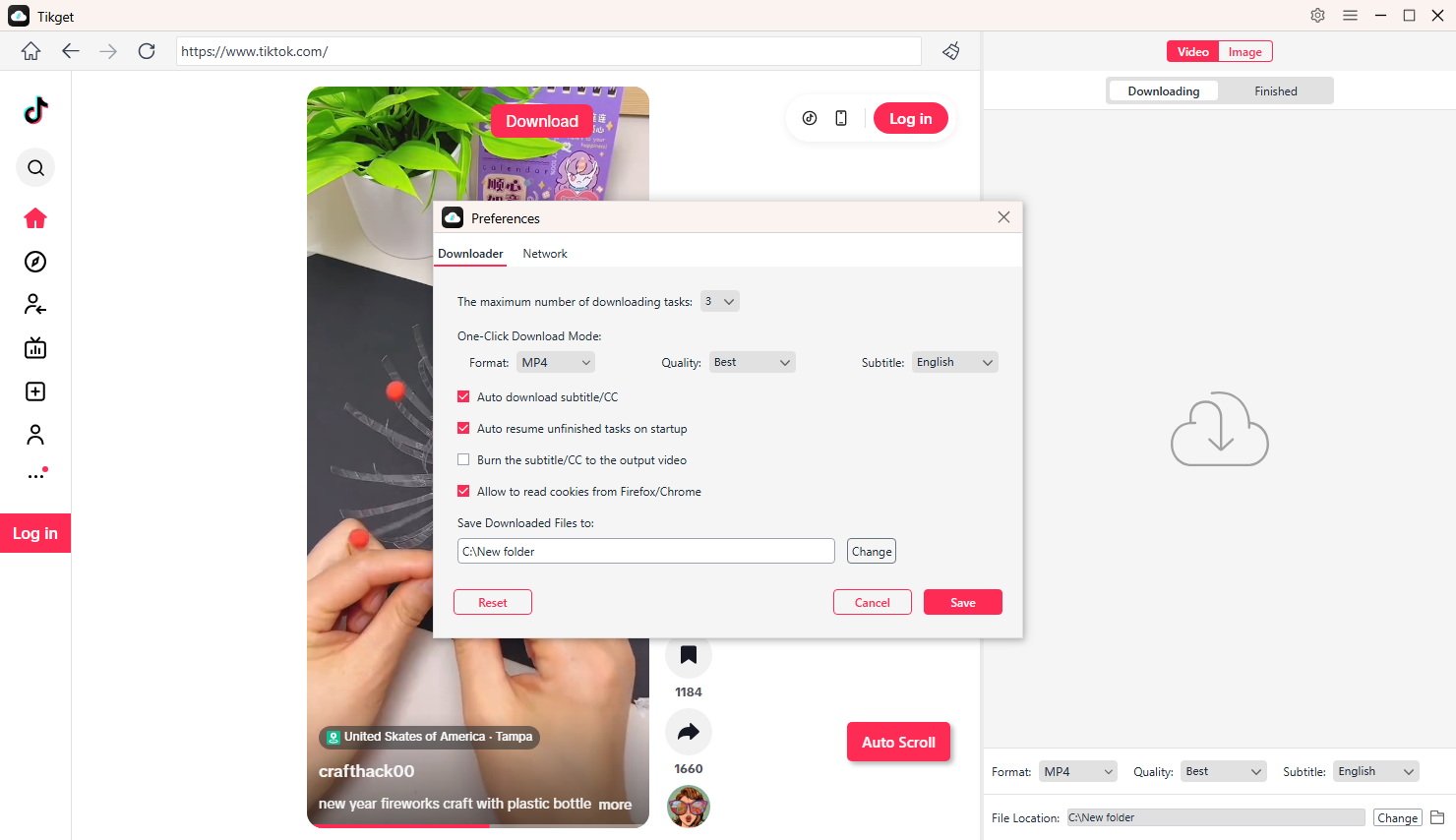 Open Tikget Preferences to choose download resolution, format, file location and more parameters.